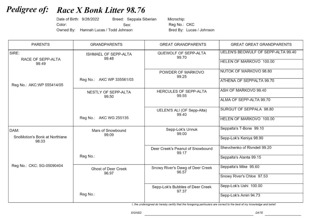 Approximately 4 years ago, I was allowed to purchase frozen semen from a dog that lived almost 30 years ago. His name was Race of Seppalta, the 3rd best racing sled dog that dog Doug Willett raised out of 450 Seppalas over his 30-year career.